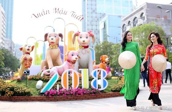 今年胡志明市2018年戊戌狗年春节花街以吉犬为装饰,所以花街到处布置着可爱的狗狗,但主要是越南本土的富国狗。越南模型怀灵儿和越南环球小姐柔贝伊在胡志明市阮惠花街漫步。