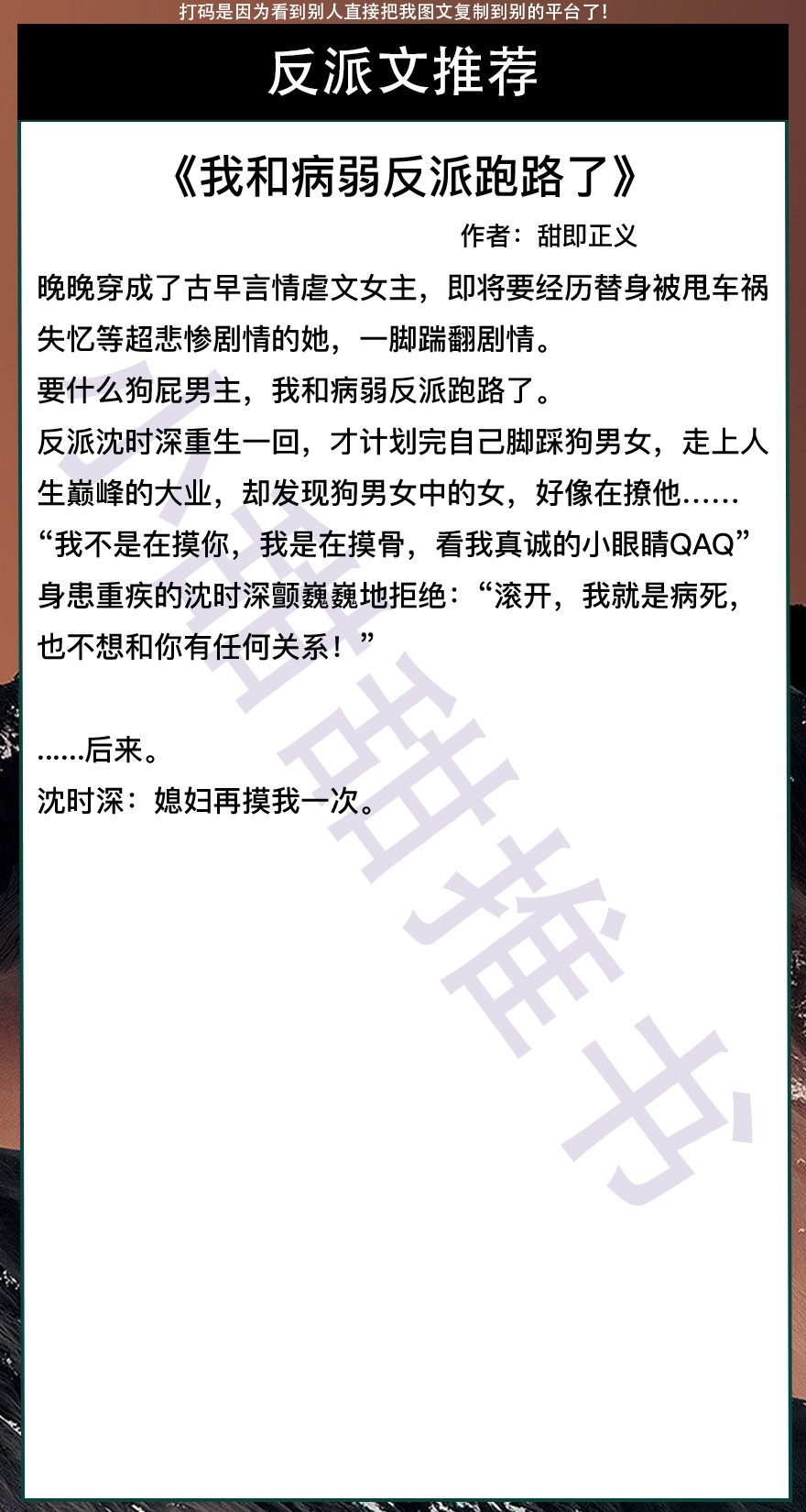 以上是本期推荐!关注我每天有不同的精彩小说推送哦!另:图片背景素材来源于网络,侵删致歉!