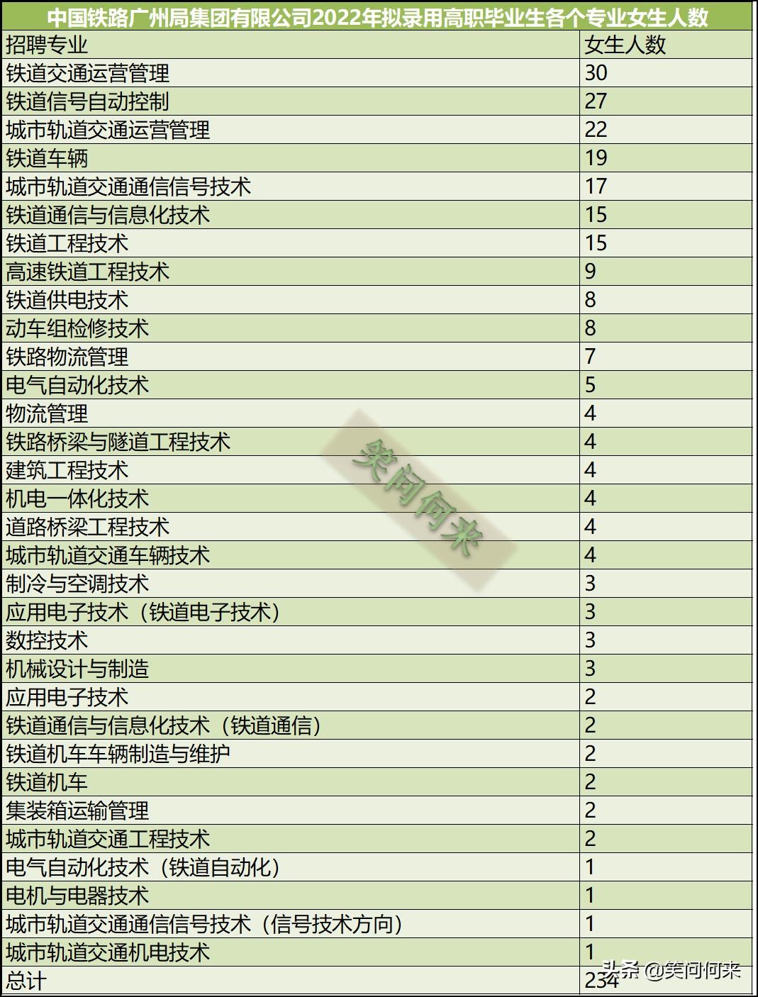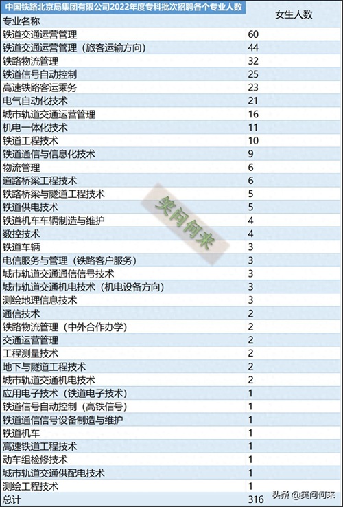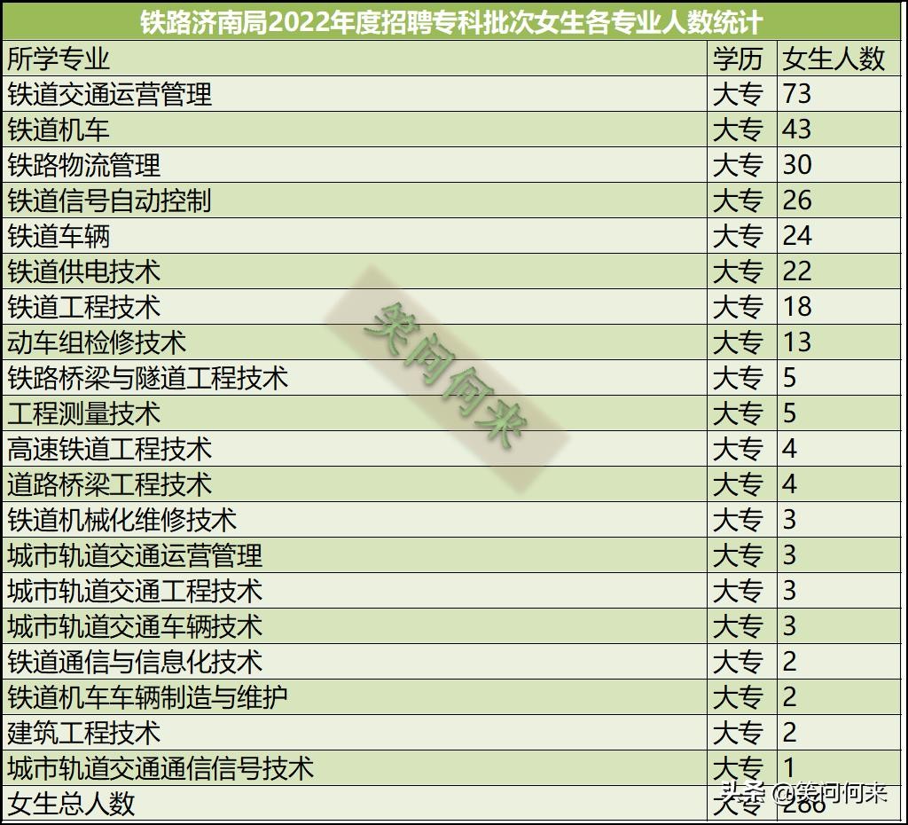 近期发布了部分中国铁路北京局、中国铁路济南局、中国铁路广州局等铁路企业2022年招聘学生的来源学校和专业情况分析,得到了较多的关注。有的家长留言,问家中女孩想进入铁路系统工作,高考报志愿的时候,选择哪个专业比较容易进入铁路系统工作。前面分享的招聘分析,主要是各个铁路集团公司公示的第一批次专科生的招聘录取情况,可以看到,专科类院校招聘,主要集中在铁路行业院校,面向铁路一线工作,招聘的男生占比达到90%左右,女生占比为10%,因此这样的院校适合男孩子报考,女生就业岗位较少,只有一些管理、服务类的工作,因此报考这类学校时要慎重。从进入铁路系统的人数来看,由于基数很大,女生还是有相当多的学生进入了铁路行业。从高考报志愿的角度看,若对铁路行业有兴趣,还是可以报考的,要选择适合女孩子招聘的专业,有哪些专业呢?我希望通过今天的表格分析,让大家看清楚铁路局在招聘时,女生各个专业招聘时的数量对比,选择哪个专业比较合适。