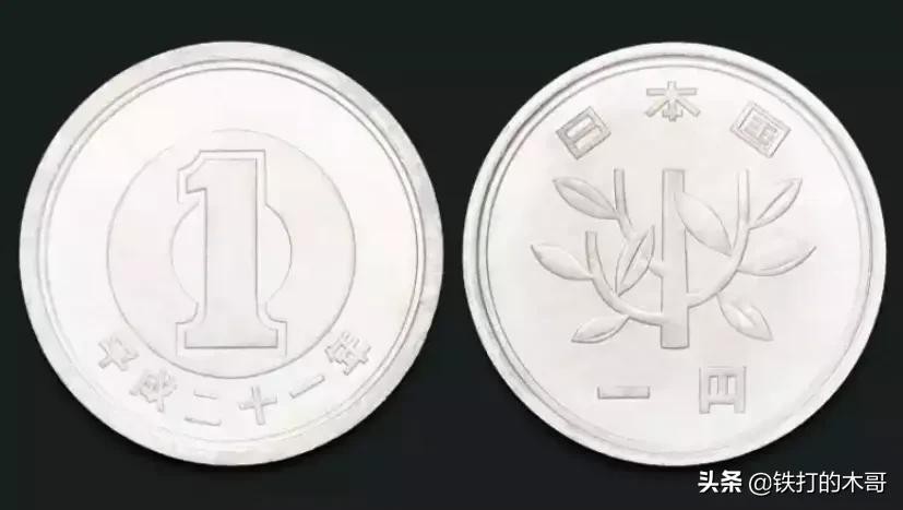 日元1円:纯铝,正面刻着1元日币的币值和发行年,背面是一种名为“若木”的植物。