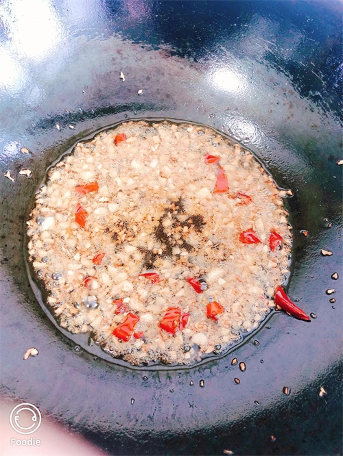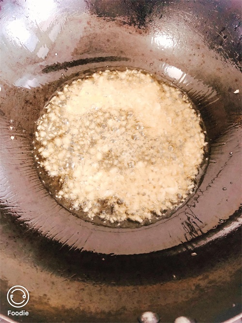 我们现在开始炒蒜蓉,锅中油温六成热,下一半蒜蓉进去翻炒,不停地翻动,要不然蒜会糊,吃起来会苦的。