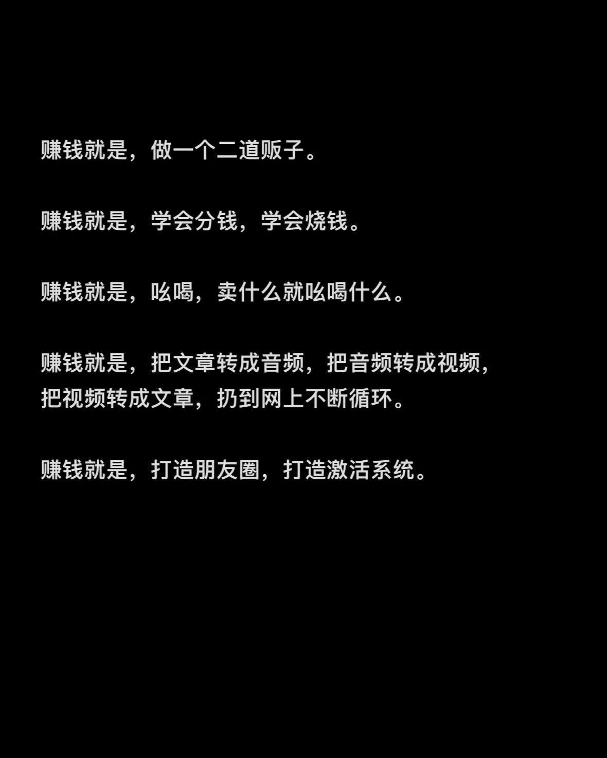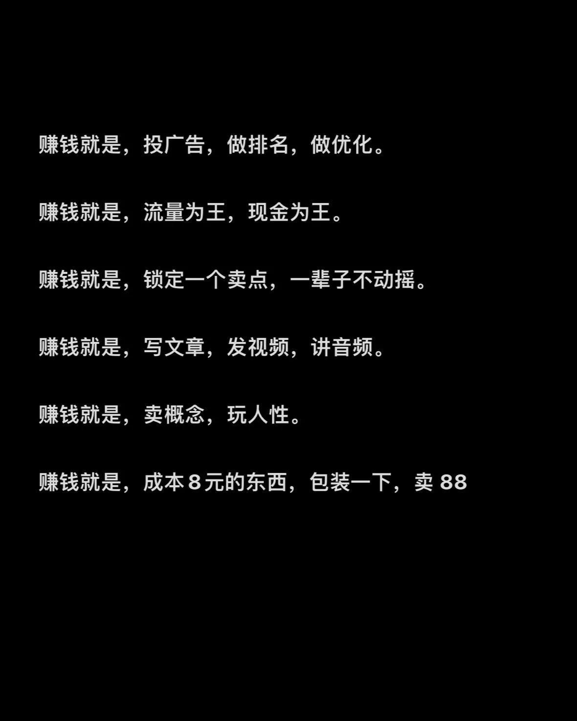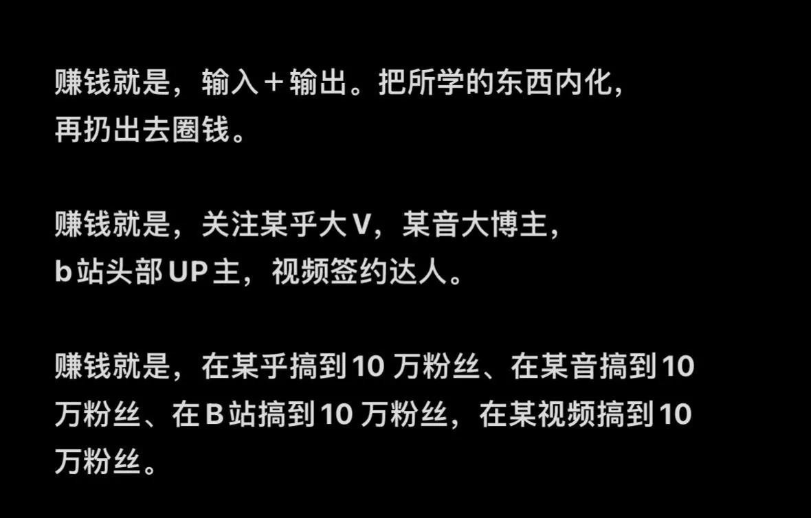 营销推广也赚钱:投广告、做排名、搞优化,让更多人看到自己的产品或服务,流量来了,钱也就跟着来了。还有打造人设、包装成功案例,吸引别人来合作或消费呢。