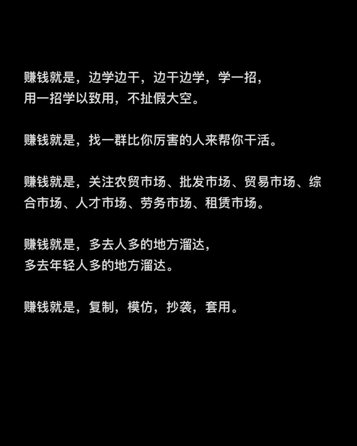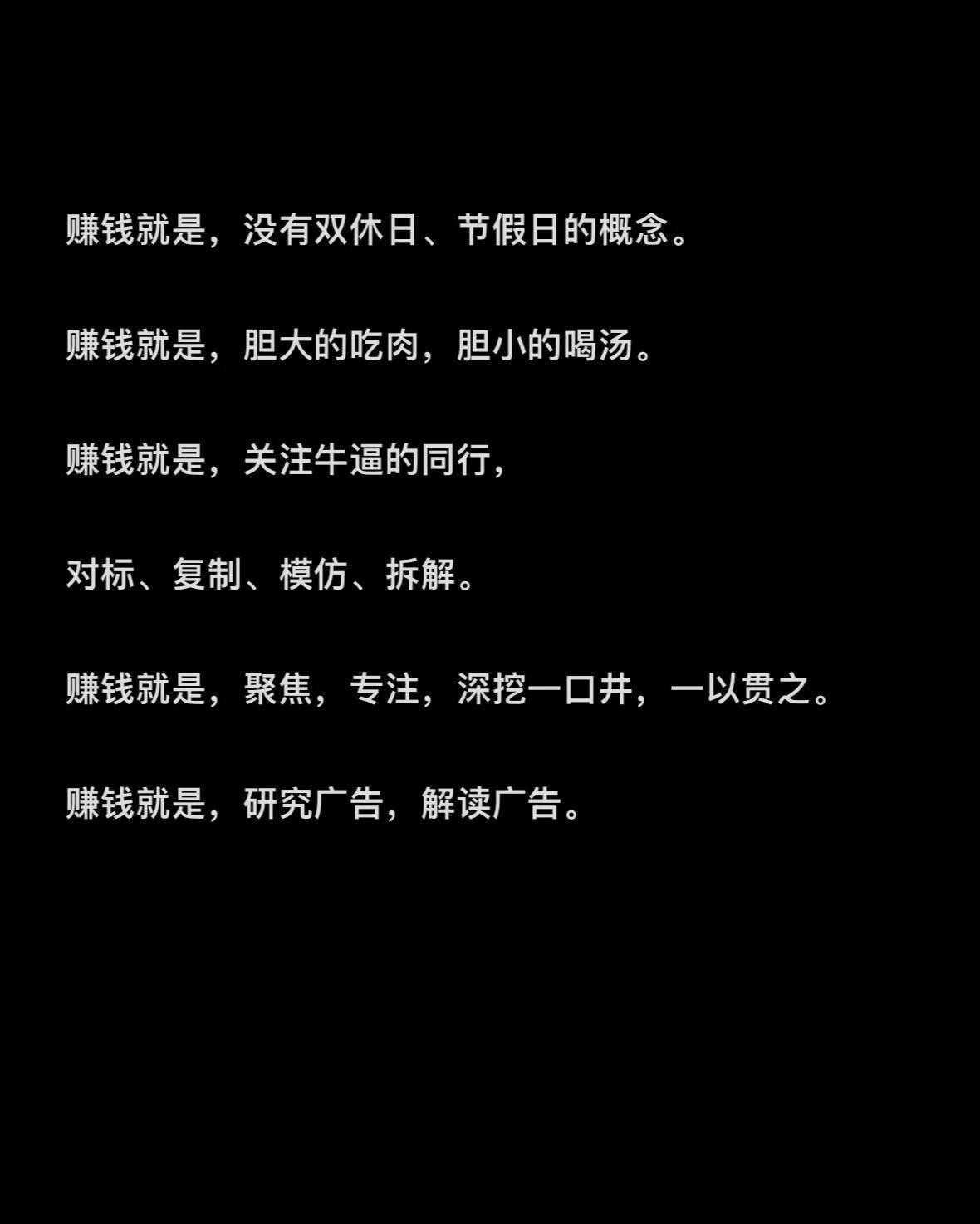 学习借鉴好赚钱:关注那些厉害的同行,对标、复制、模仿他们的做法,再结合自身情况去深挖,聚焦在一个点上发力,也能走出赚钱的路哦。