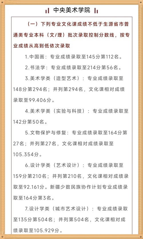 二、中央美术学院,通常被认为是中国八大美院之首,具有很高的学术声誉和专业水平,大家看一下中央美术学院的专业成绩录取及排名,应该都是专业分排名老大了。