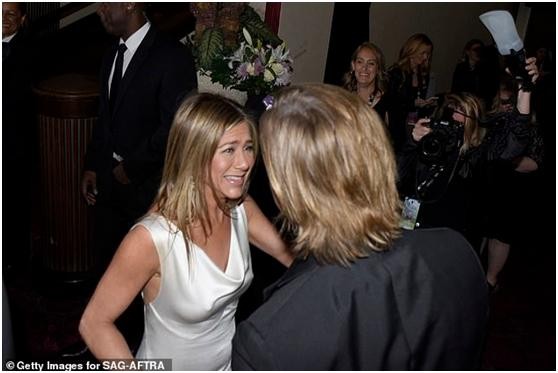 安妮斯顿领奖后也来到了后台,两个人就这样相遇了,迅速被媒体捕捉到,这也被外媒称作“名场面”,因为这是两人自从2005年离婚后第一次在美国演员工会奖颁奖典礼上的合照,可以看到安妮斯顿刚见到皮特时难掩激动的神色。
