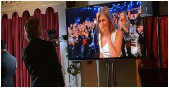 拿了奖的皮特走到后台,站在屏幕前观看,当轮到安妮斯顿上台领奖时,皮特兴奋的喊出“哇噢!太棒了!”俨然一副看着自己爱人夺奖的喜悦样子。