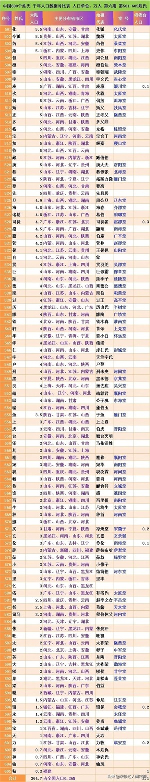 本次统计605个的姓氏,涵盖了当前中国大陆的13.7亿人口,占人口总数的97%。以及涵盖了港澳台地区的2950多万人口,占港澳台华人总数的95%以上。
