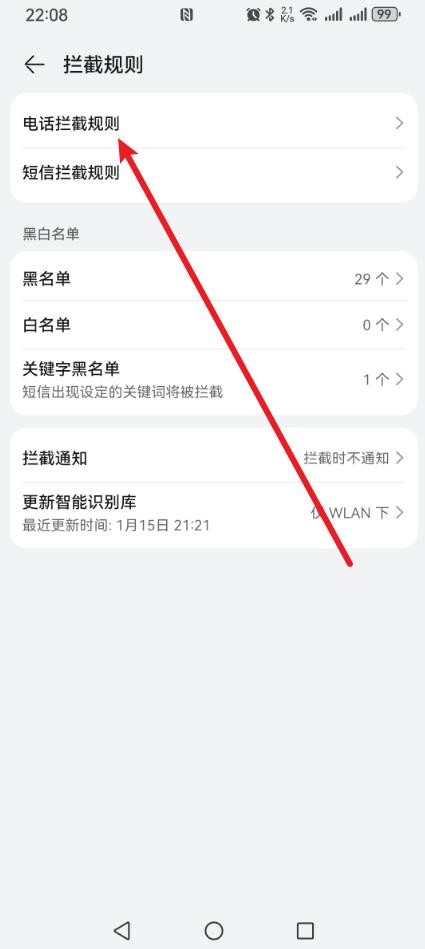 第三步:进入拦截规则页面后,我们需要选择拦截的类型,点击【电话拦截规则】选项即可;