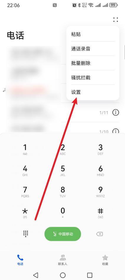 第二步:进入电话页面后点击右上角的【4个点】,然后找到【设置】,点击它;