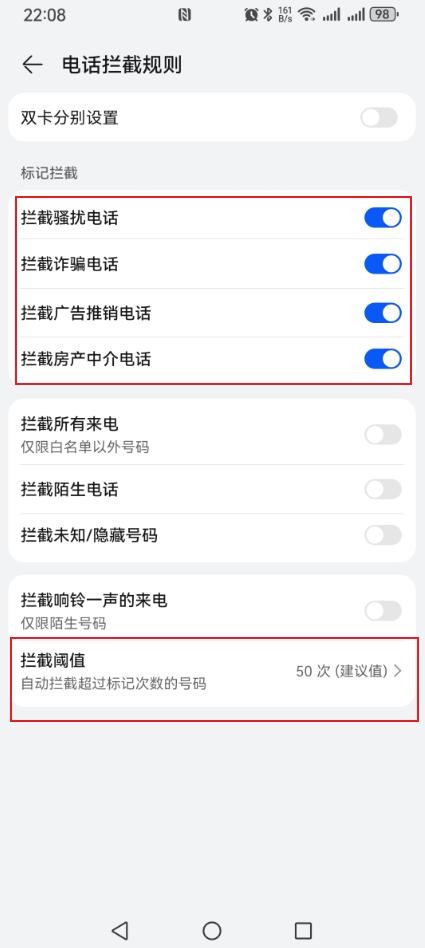 第四步:接着我们就能对陌生电话的拦截进行一系列的设置,首先需要将【标记拦截】下方的骚扰电话全部开启拦截,其次我们可以设置一下最底部的【拦截阔值】,默认是50,我们可以调整到20-30左右,意思是如果来电被他人标记了20次以上为诈骗电话,是会直接拦截的;