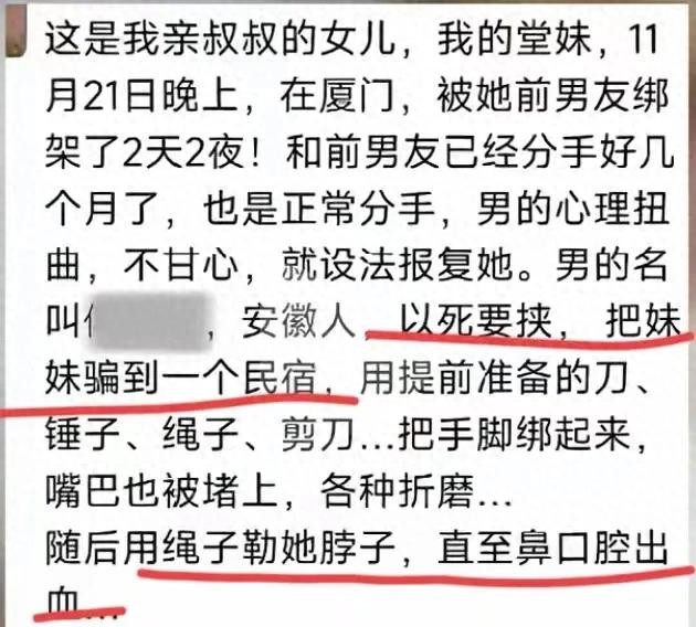 厦门一名20岁女孩遭遇了前男友的疯狂报复。女孩被前男友要挟骗至民宿,随后经历了长达2天2夜的虐待。在这段时间内,前男友使用了捆绑、堵嘴、勒脖子、泼开水等极其残忍的手段对她进行折磨。女孩因此鼻口腔出血,一度被勒晕,甚至遭受了三度烫伤,身心均受到了极大的伤害。