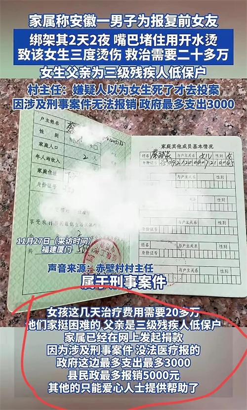 女孩目前躺在病床上,面容憔悴,急需治疗。然而,治疗费用高达25至30万元,这对于一个本就困难的家庭来说无疑是巨大的负担。女孩的父亲三级残疾,靠吃低保维持生活,根本无法承担这笔费用。而前男友来自单亲家庭,其亲爸和后妈均不愿承担赔偿责任,这使得女孩的治疗费用问题更加棘手。