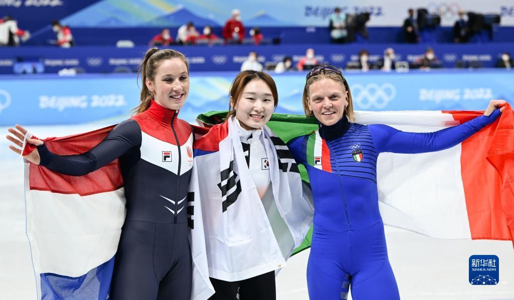 2月16日,冠军韩国选手崔敏静(中)、亚军意大利选手阿里安娜·方塔纳(右)与季军荷兰选手苏珊娜·舒尔廷在比赛后。