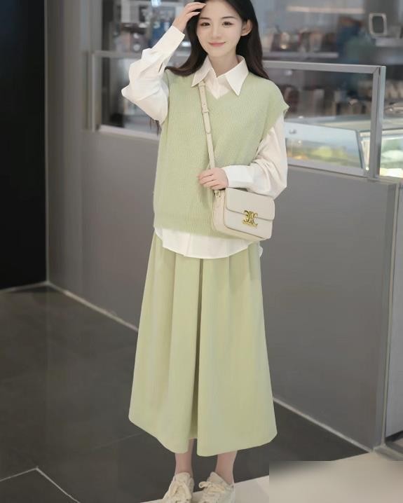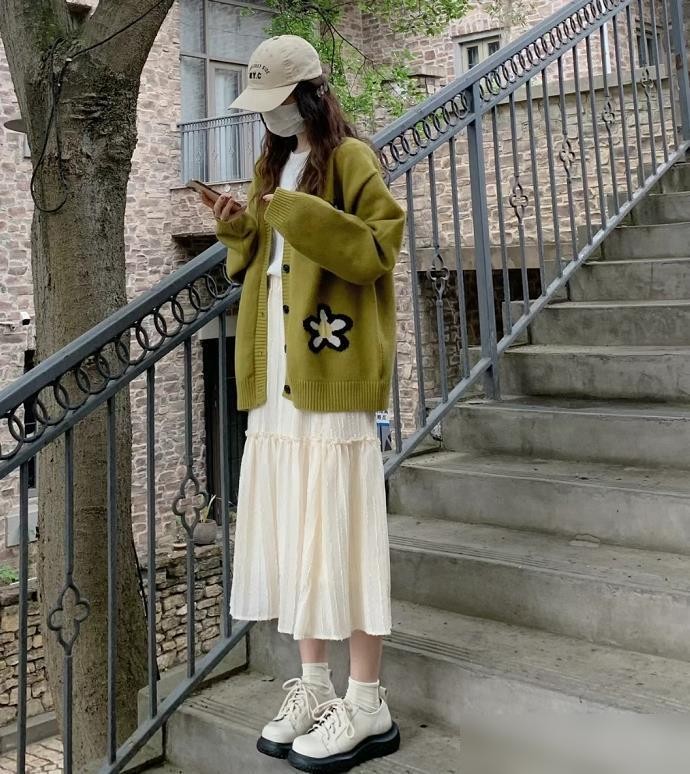 绿色单品和奶油色的搭配也是很经典的,温柔的奶油色调百搭不挑人,而温柔的奶油色又可以衬托出绿色单品的高级感, 也让自己的搭配变得更加有层次感,像穿这样的长裙,加入了奶油色的匹配,整个人的气质就变得很温柔了。