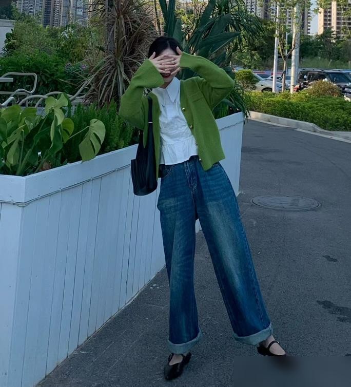 如果想要打造休闲感,可以尝试绿色和牛仔蓝的搭配,牛仔蓝是很日常的色调,用在我们的日常穿搭中自然而不做作。牛仔蓝的牛仔材质休闲感十足,穿上这样一件单品和绿色的清新感结合,展现出了满满的潮流感。