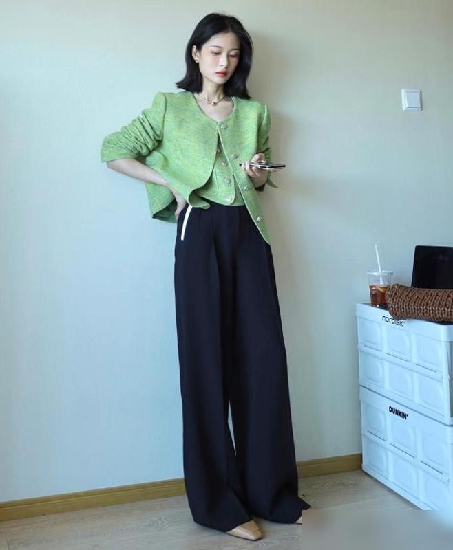 绿色单品和黑色的组合向来是经典,黑色是很低调的色调,而绿色又是比较明亮的颜色,正好可以利用黑白灰的沉稳色调去衬托绿色的高级时髦, 而且黑色经典百搭,无论是穿裙子还是穿裤子,只要在服装上加上黑色的点缀,搭配看上去都很利落。
