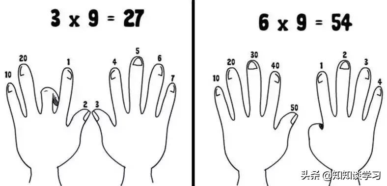 从左往右数,第几个手指弯曲表示几九的几,弯曲手指的左边表示积的十位上的数字,右边表示积的个位上的数字,学生既感兴趣而且又记得牢。