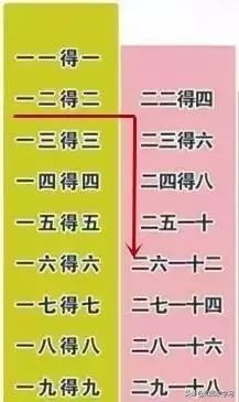 比如,首先背一二得二,此时接着背二二得四,这时拐弯向下背二三得六、二四得八、一直到二九十八;然后回到一三得三、二三得六、三三得九,再拐弯往下三四一十二,一直到三九二十七;如此类推,回到一四得四接着拐弯。这样背的一个特点是,从一到九的口诀都有九句,几的口诀就逐渐增加几。
