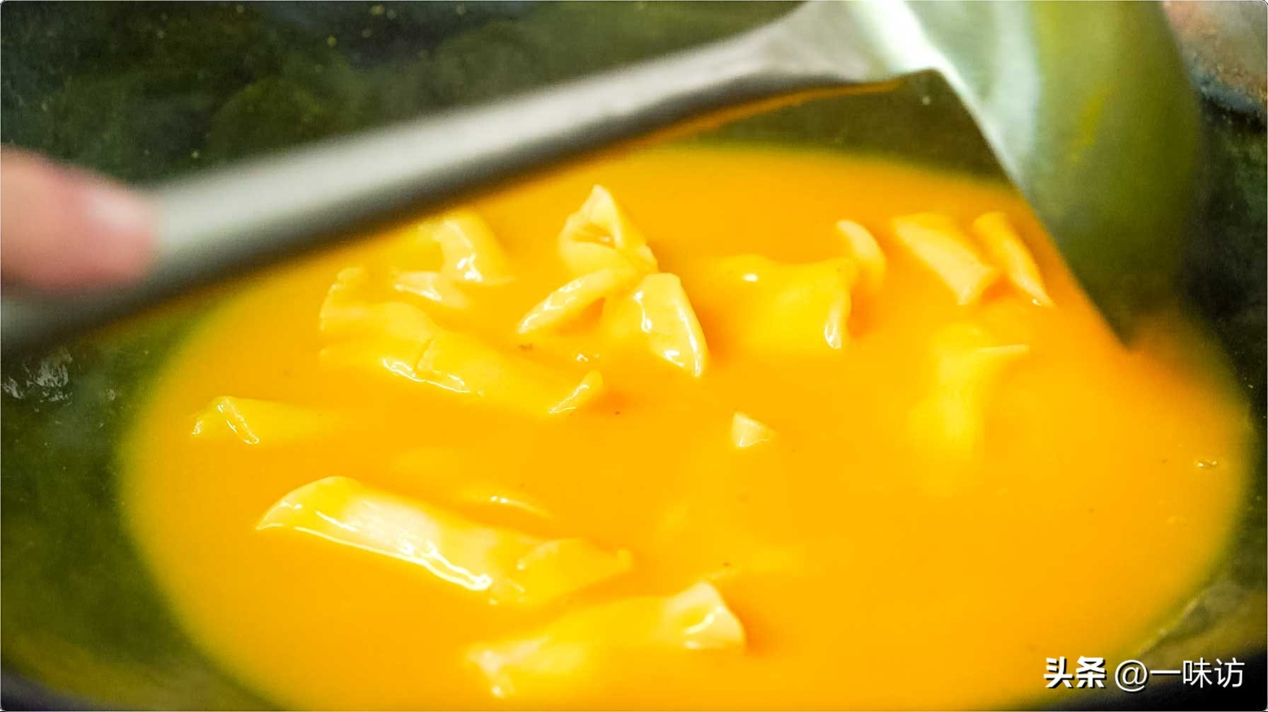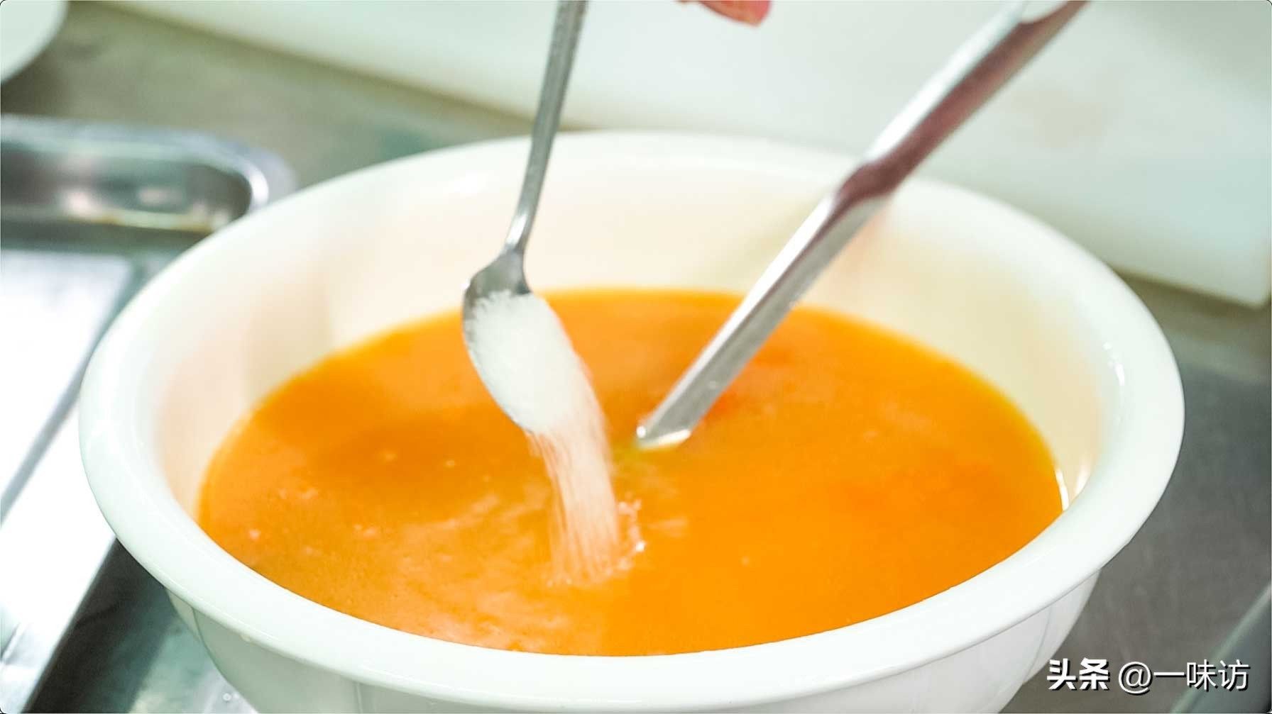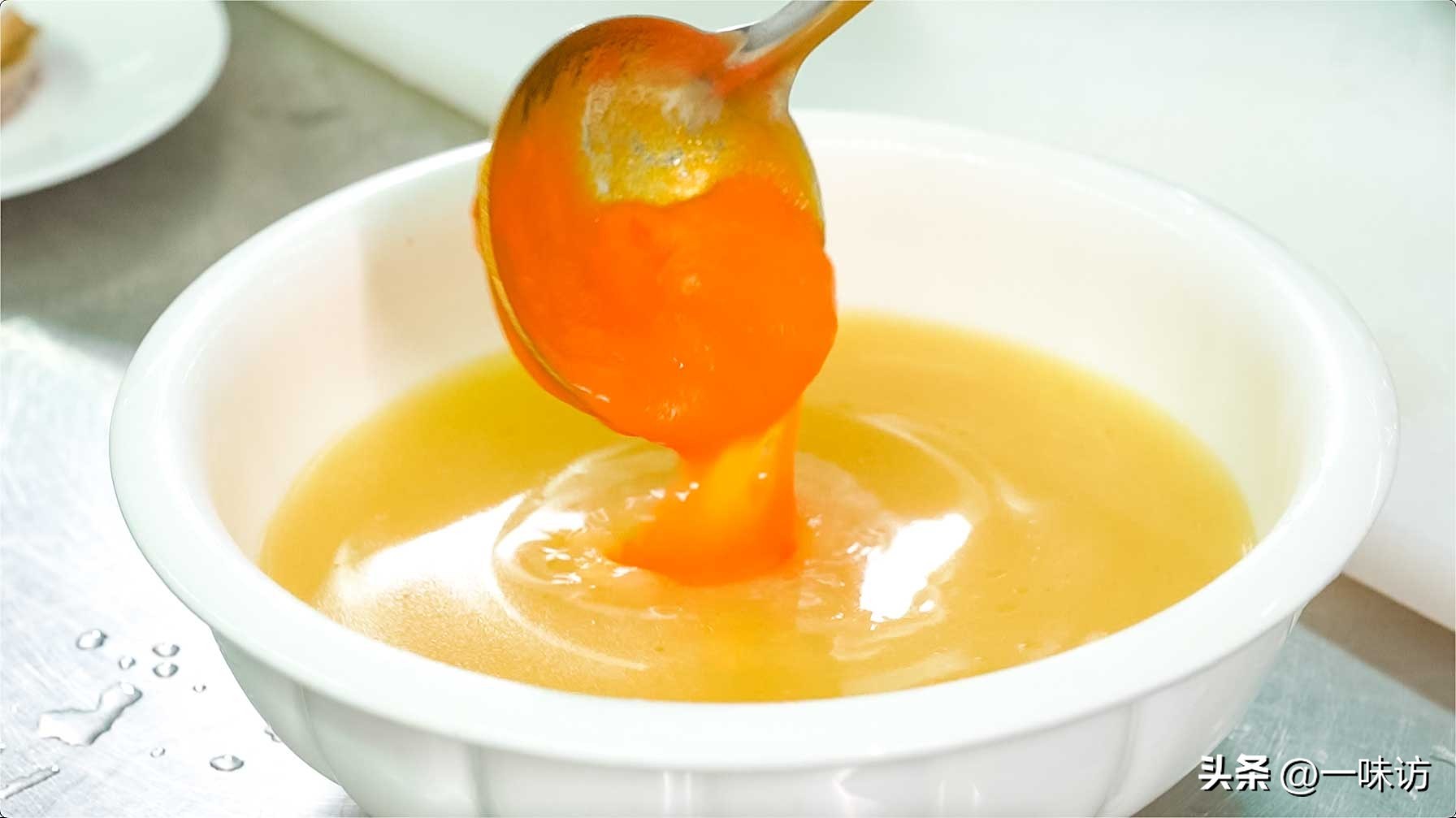 金瓜去皮去籽,切片,上锅蒸15分钟,蒸熟后加清水用料理机打成南瓜汁,过滤备用。