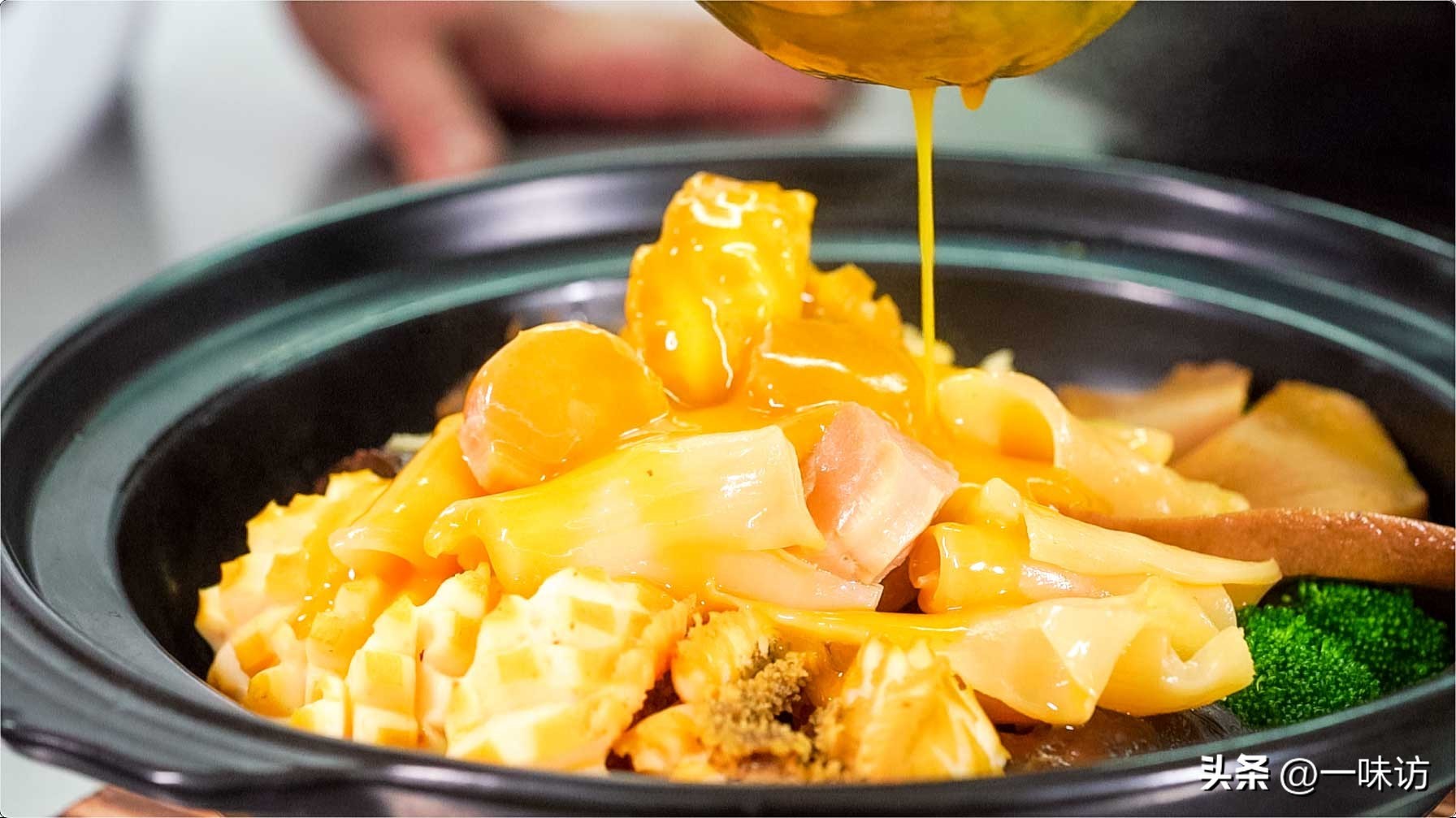 锅中加入600毫升高汤,烧开后把泡好的食材(泡好的花胶150克,鲜鲍鱼肉5只,泡好的海参150克,鹅掌200克,泡好的瑶柱60克,冬菇50克,白灵菇150克,西兰花30克,南瓜汁100克,水淀粉10克,盐12克,)倒入锅中煮五分钟后。