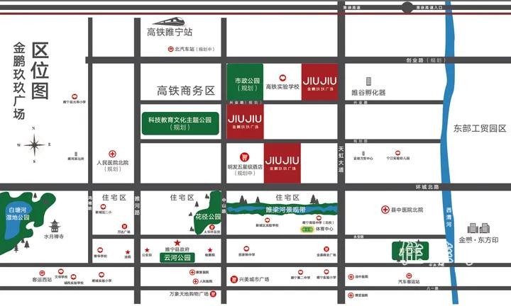 金鹏玖玖广场位于睢宁高铁商务区,东临天虹大道,西临睢魏路,北临规划创业路,南临兴业路,集购物、休闲、餐饮、娱乐、文化于一体的一站式购物中心,满足周边居民及商务人群的多重需求。
