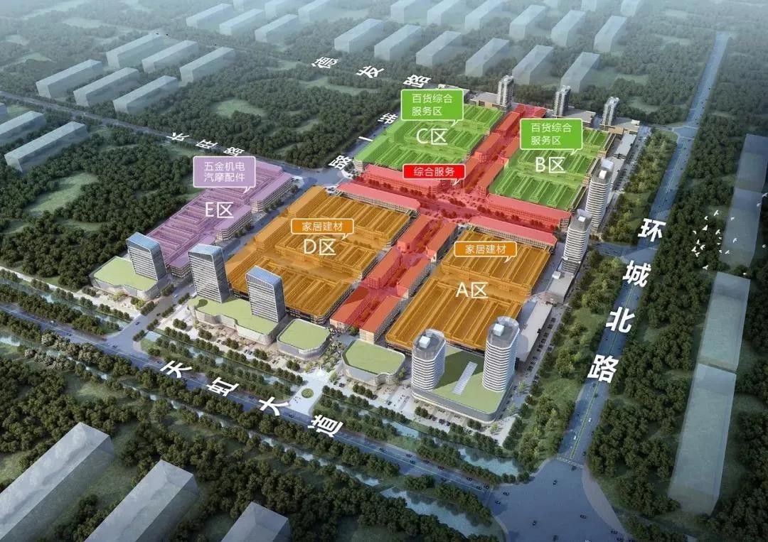 项目规划建设有家具品牌中心、家居建材交易中心、会展中心、五金机电交易中心、百货商品、电子电气、汽摩汽配交易中心、农副产品交易中心等,是一座多业态、多服务、多功能的超大型一站式购物批发城。