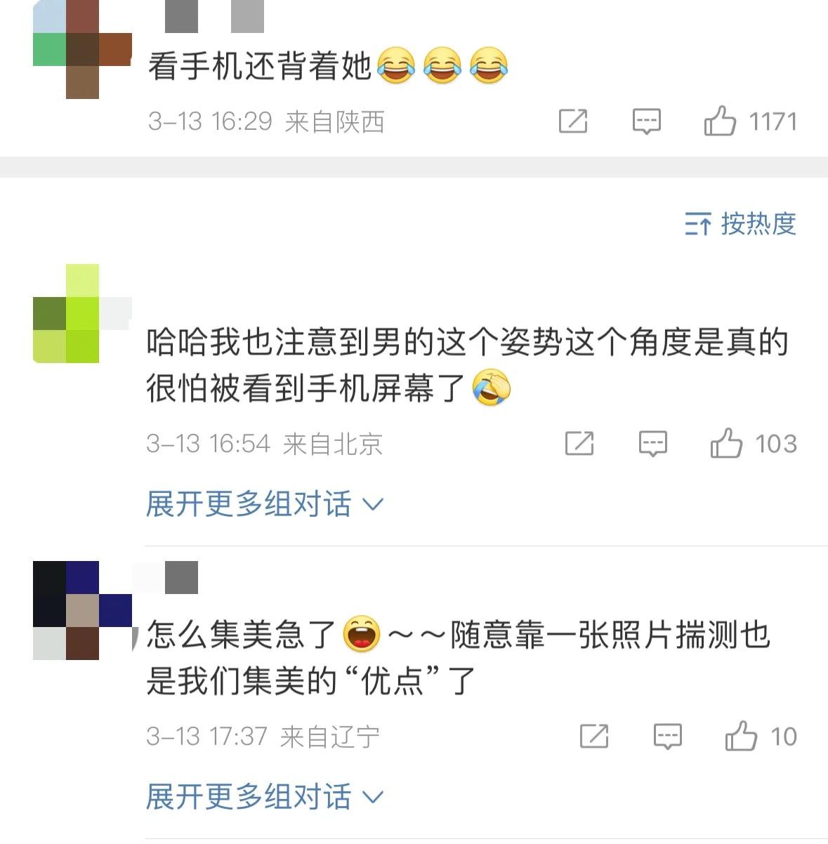 有网友说,照片中的两人都有些防备对方,看手机的角度往自己方向倾斜,似乎不想让别人看到手机内容。
