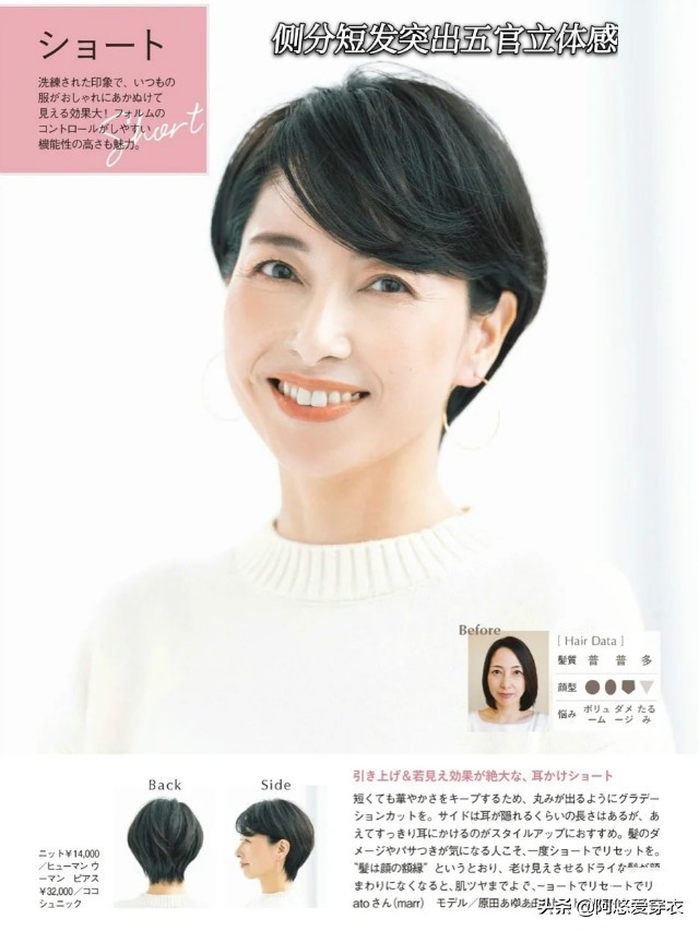 侧分短发在保持了40岁年龄成熟稳重气质的同时,又在无形之中增添了几分俏皮活泼的洒脱感,侧分会比中分更加能遮挡脸型和脸上的肉,凸显出五官的立体感,同时对发量不多的女性来说也十分友好。