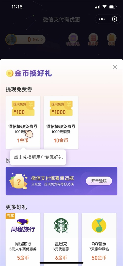 点击最底部的金币换好礼,就可以看到金币兑换免费券的选项了,1个金币兑换100元的微信提现免费券,10个金币兑换1000元的微信提现免费券。