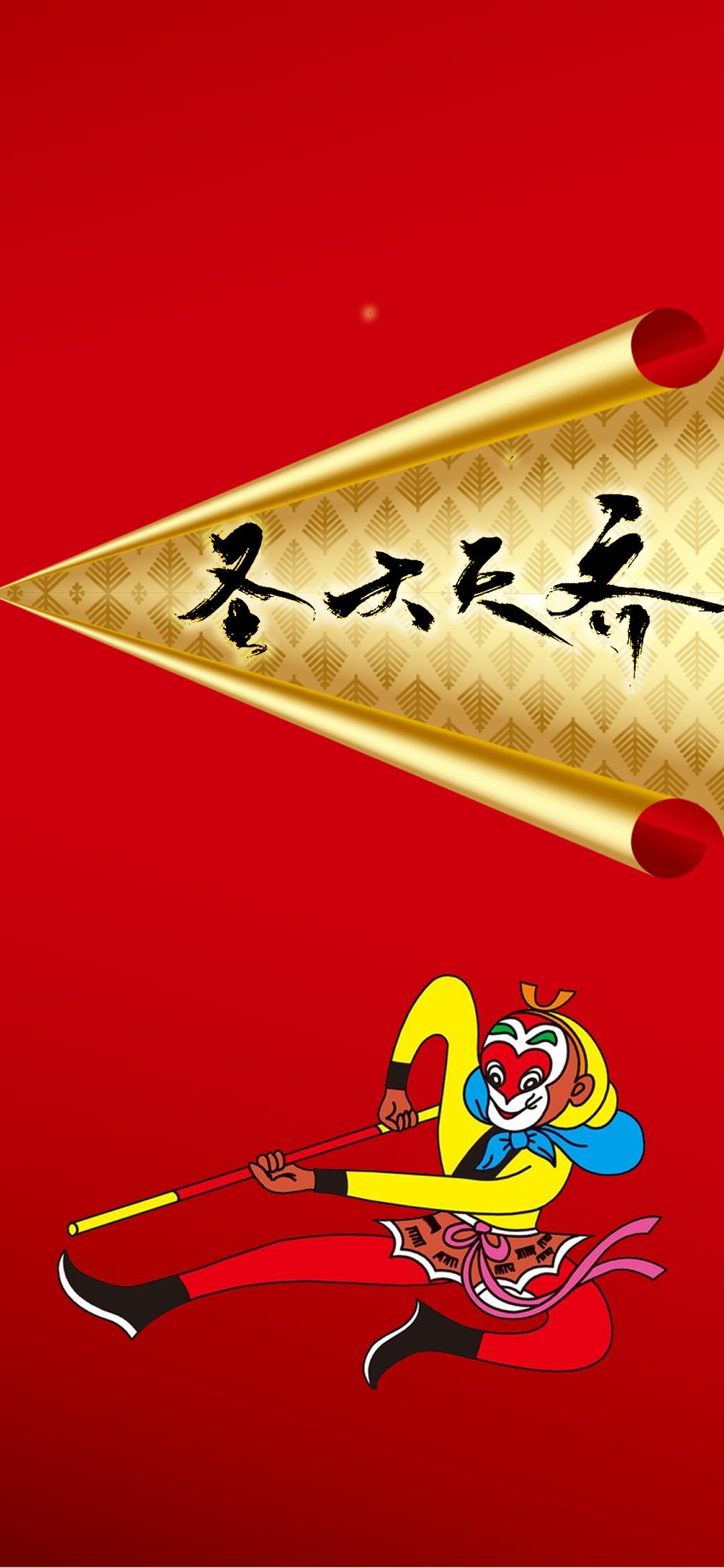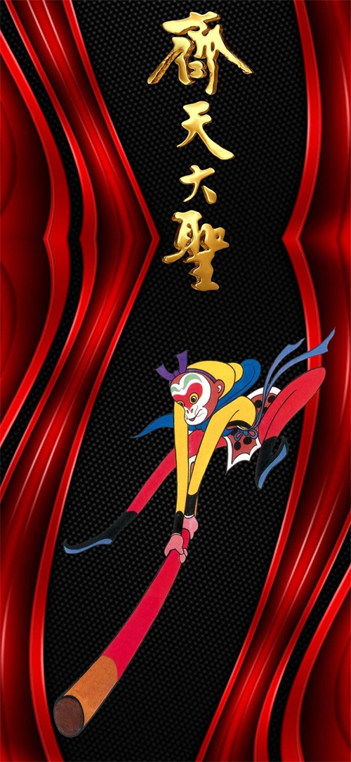 下面这张壁纸,背景是福图一刻拼接而成,在卷起的金箔纸里面,我把“齐天大圣”四个书法字横置排列,下方的悟空形象生动自然,非常喜庆。