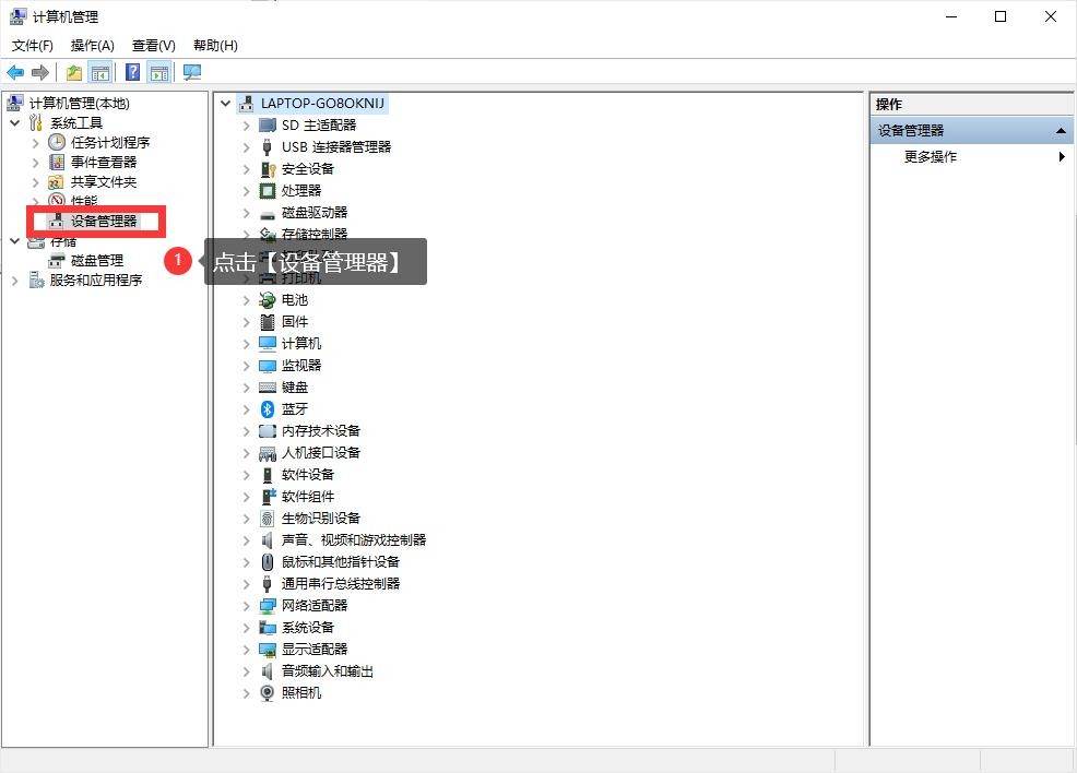 步骤2:进入【计算机管理】页面后,点击左侧的【设备管理器】。