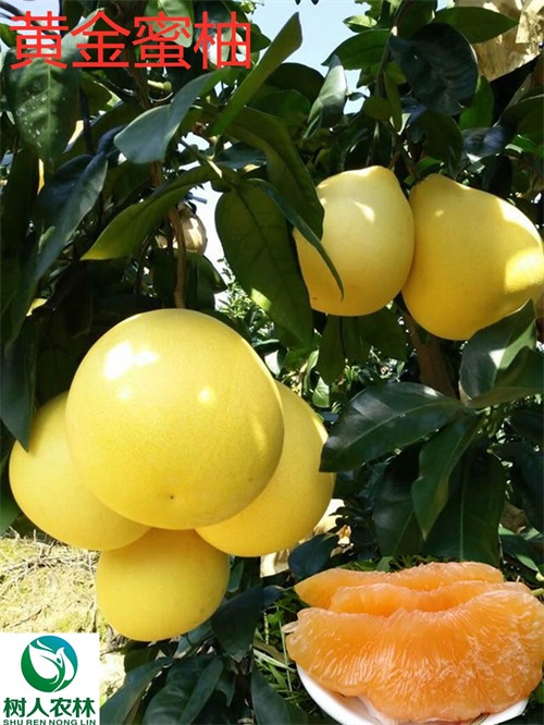 黄金蜜柚树势较旺,果实倒卵圆形,果顶平滑,有明显印圈。单果重1千克——3千克,叶片、嫩芽和果皮呈金黄色,甜味及营养元素高于其他蜜柚。果肉金黄色,汁多,甜酸适口,种子退化为瘪籽,是目前蜜柚之中的精品。