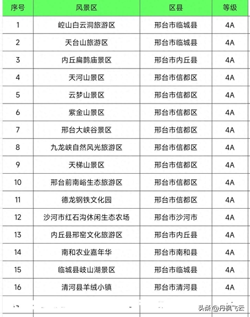 邢台十六景,邢台16个国家AAAA级风景区,信都区8家,临城县3家,内丘县2家,沙河市1家,南和区1家,清河县1家。