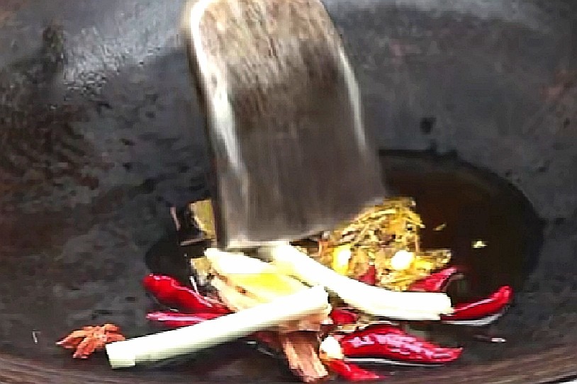 4、起锅下入50克菜油,油温4成热下入姜片、大葱干海椒及所有香料小火炒出香味。