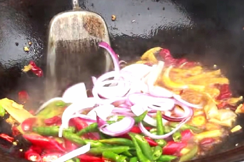 3、下入青椒、红椒、洋葱大火炒至断生。