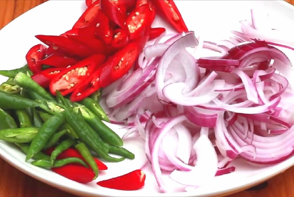 2、洋葱一个切丝、青红椒各50克切斜刀。