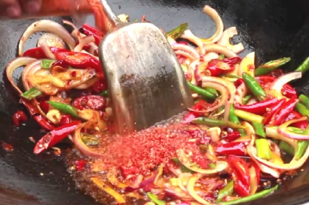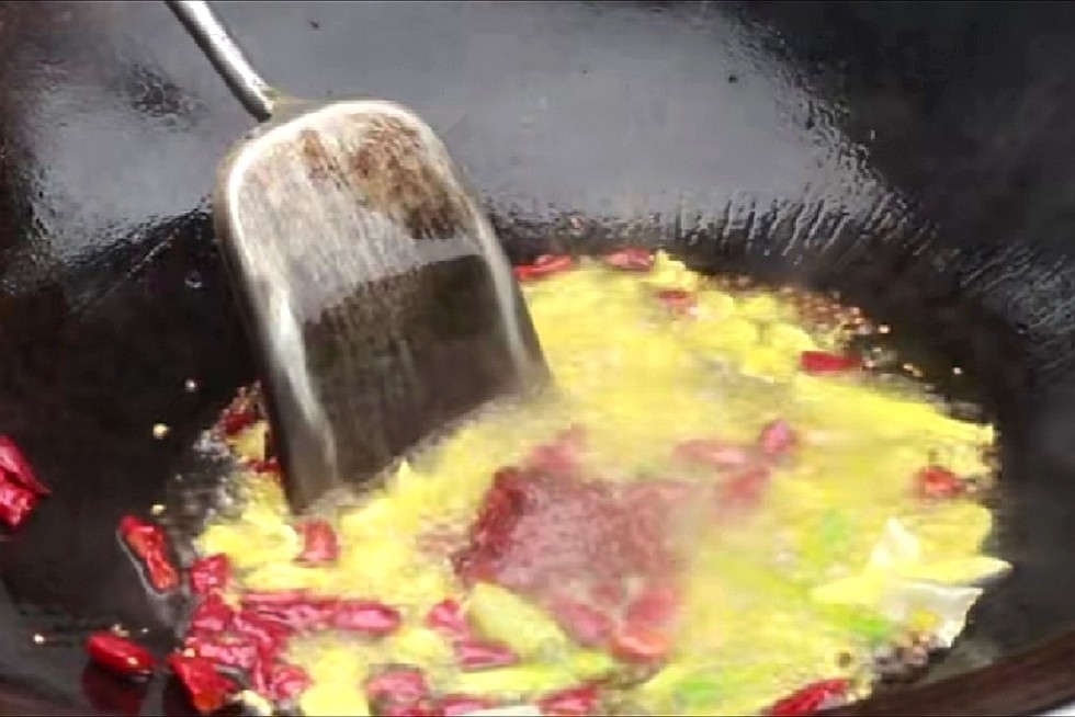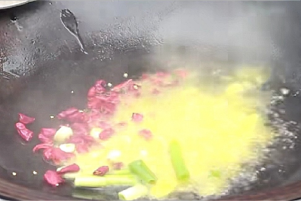 1、起锅加入100克菜油、50克猪油至油温六成热下入花椒、大葱、姜、蒜、干辣椒。