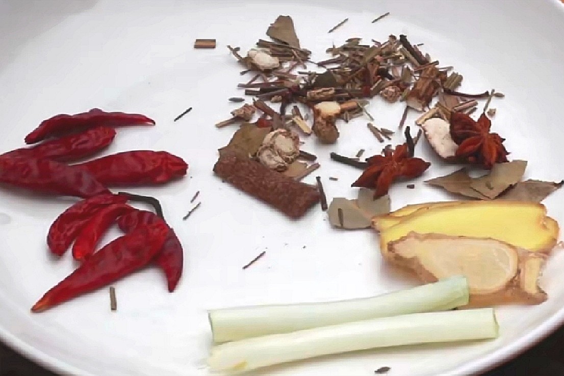 3、准备八角两个、桂皮一小节、香茅草适量、良姜5片、香叶5片、甘草3片、干辣椒8个、大葱两大节大慨30克、姜片3大片。