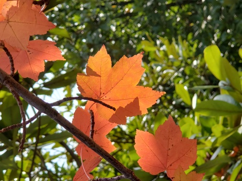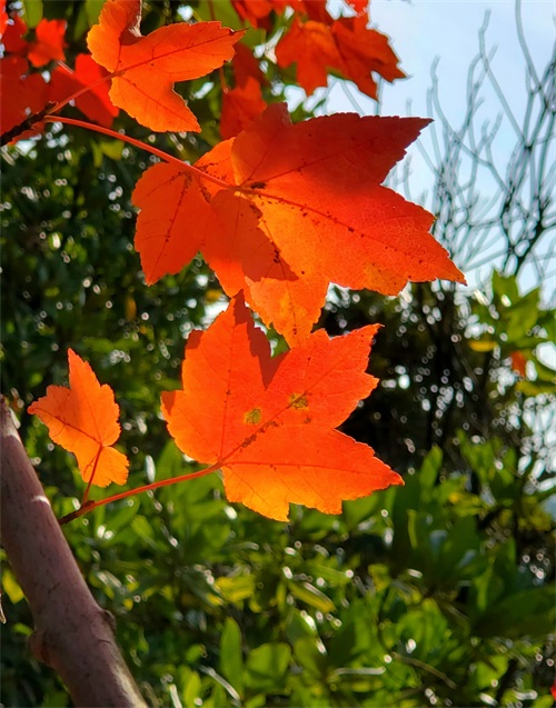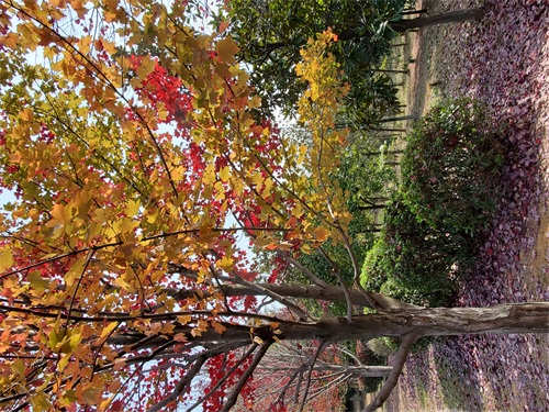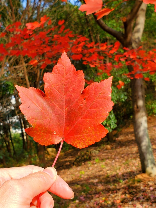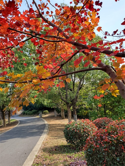 漫步在山顶的红枫大道,可以看到另一种亮色正展现着别样的“枫”情。这里枫叶以红色为主,兼有黄色、金色,五彩斑斓,流光溢彩,观枫指数应该是五星了,随手一拍,都是大片了。