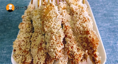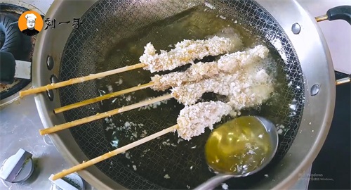 5、然后用竹签把鸡胸肉串起来,再把串好的鸡胸肉裹上面包糠。锅烧热后到入色拉油,等油温升至六七成热把鸡胸肉串,放入锅中,因为竹签比较长,油里没炸到的地方用勺子把热油浇在上面