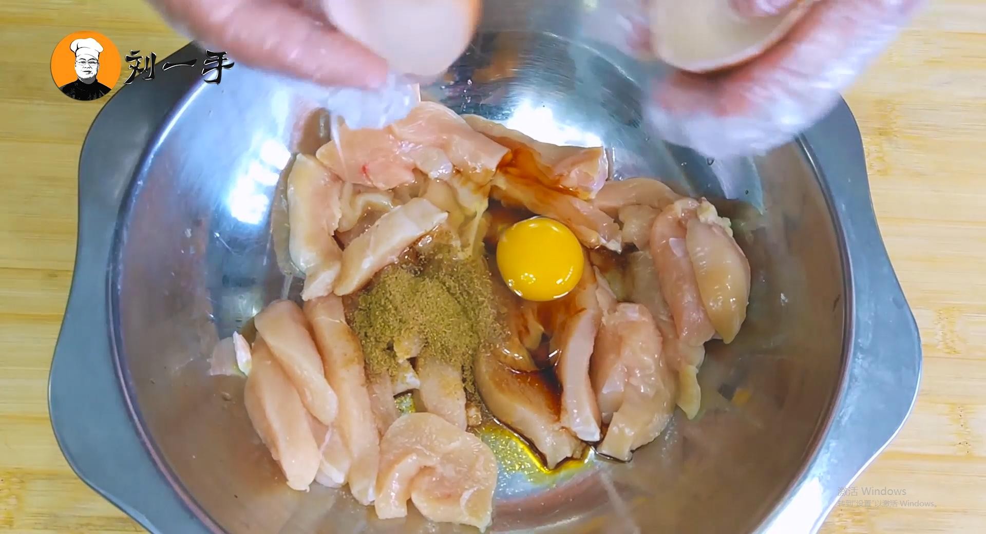 4、鸡胸肉先切片再切条,鸡胸肉腌制下,先放入小半勺盐、生抽少许、孜然粉、一个鸡蛋,用手抓匀,再放入少许鲜辣粉、适量生粉,再次用手揉抓均匀,腌制三十分钟