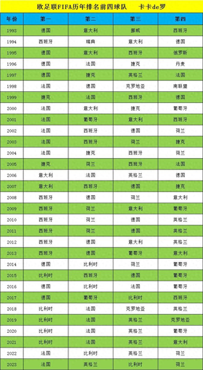 本文将介绍自国际足联1993年引入世界排名系统以来,欧足联协会球队历年年终排名前四球队的情况:
