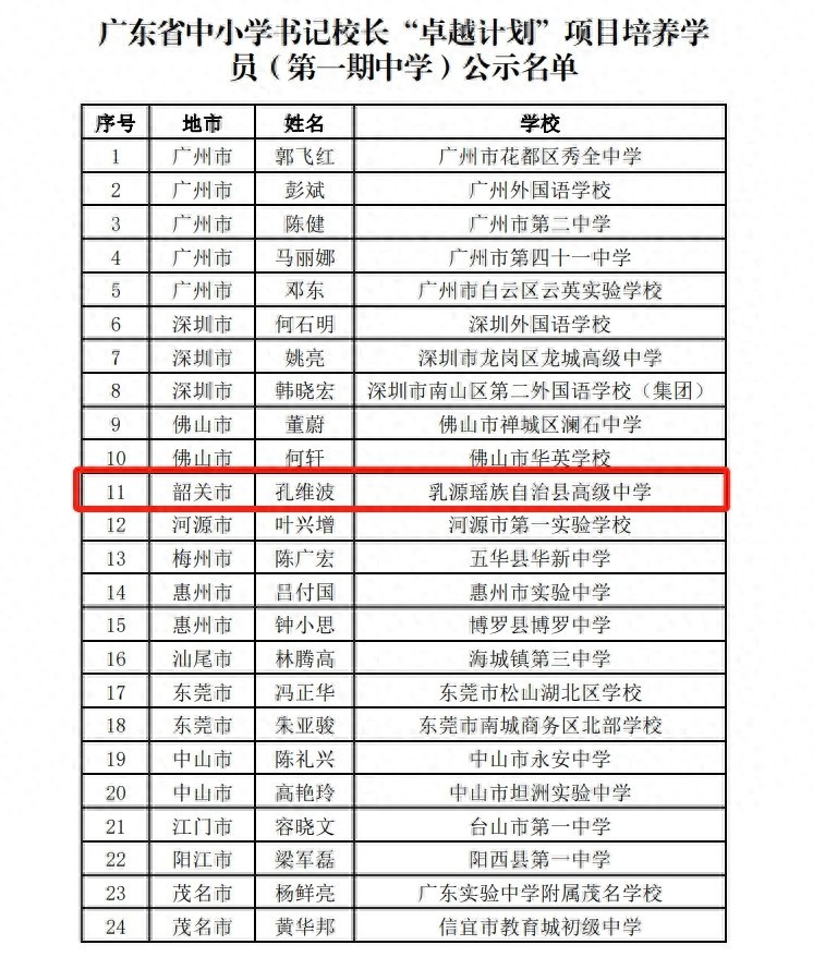 其中,韶关市乳源瑶族自治县高级中学校长孔维波入选。孔维波,特级教师、三级教授,硕士,曾连续担任四届广东省名教师工作室主持人。