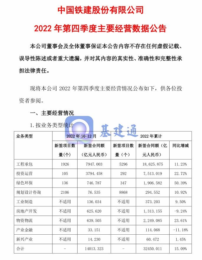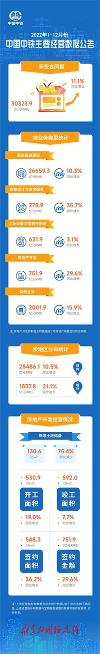 近日,中国中铁对外发布了2022年全年经营数据,2022年中铁全年新签合同额超过3万亿元,同比增长11.1%,创造了历史新高。