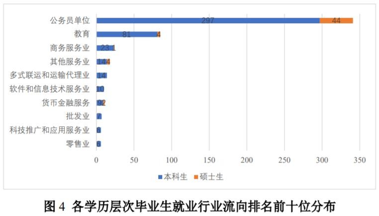 分学历来看,硕士毕业生 主要流向了公务员单位、教育、其他服务业,合计占比 70.27%;本科毕业生主要流向了公务员单位、教育、商务服务业,合 计占比 66.83%。