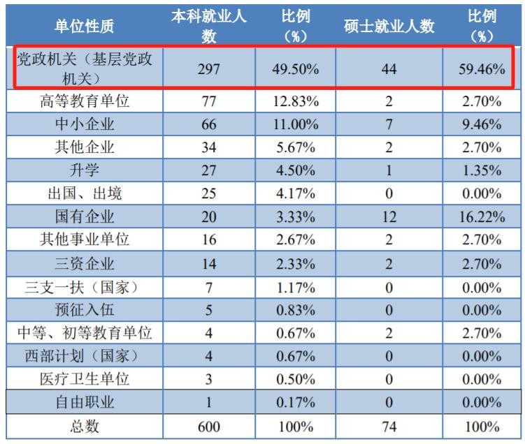 2018届,全体本科毕业生480人,签约党政机关 212 人,基层党政机关 10 人。