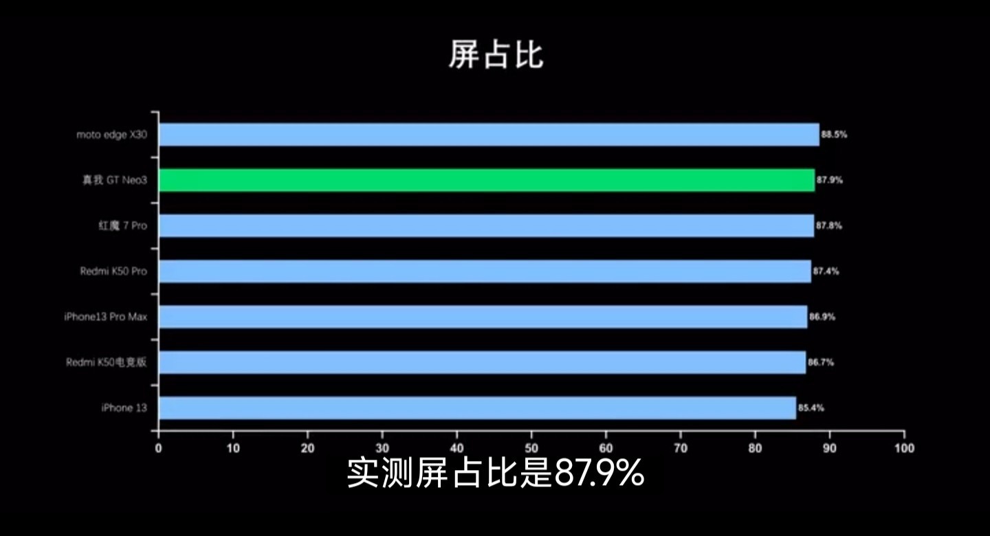 在发布之后还有网友吐槽真我GT Neo3的边框比较大,那可真是震惊到我了,估计说这些话的网友肯定没见过真机也没看过测评,科技美学 在屏占比上也做了一个实测,真我GT Neo3的屏占比达到了87.9,排在排行榜的第二名,钟文泽 博主也在视频中对比了一下,刚刚发布的红米k50pro和真我GT Neo3,两款手机的正面几乎是一模一样,都是中置打孔直屏,估计关上屏幕,这两款手机都会让人分不清。
