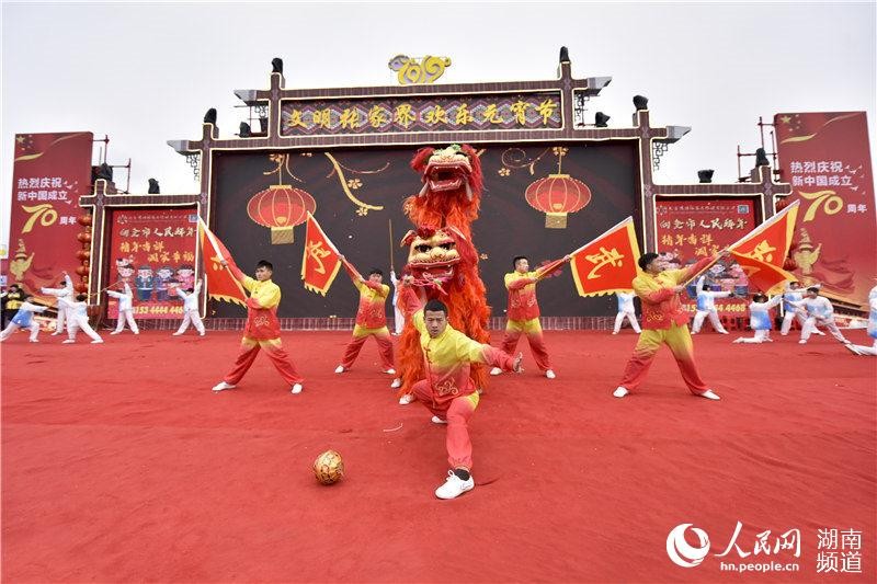 人民网长沙2月19日电 (记者 王云娜)天门盛装庆佳节,澧水欢腾闹元宵。2月19日,湖南省张家界市民广场锣鼓喧天,热闹非凡,唱花灯、舞龙狮、观灯会、赏歌舞……100多支表演队伍同城献艺,与近30万群众和游客一道共度佳节。