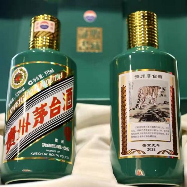 虎年茅台酒的外观设计上采用的是生肖茅台酒“家族”传承式元素设计风格,正标采用的是五星茅台酒的正标设计,仅在右下角拓印有“壬寅虎年”的印章来表明产品身份。而背标则采用的是依旧采用了大师国画影印其上的设计风格,契合传统农历生肖的动物形象的国画作品,将国画艺术、生肖文化以及茅台文化完美融合在一起。除此之外,与牛年茅台酒相同,虎年茅台酒瓶瓶盖斜印字母暗记和使用两圈齿轮加强防伪。