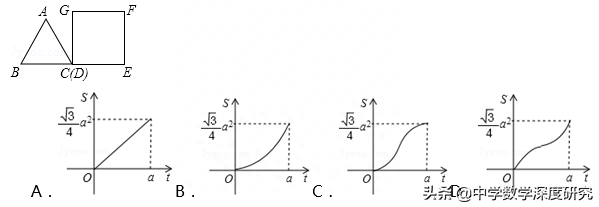 例3.(2018秋•石景山区期末)如图,等边三角形和正方形的边长均为a,点B,C,D,E在同一直线上,点C与点D重合.△ABC以每秒1个单位长度的速度沿BE向右匀速运动.当点C与点E重合时停止运动.设△ABC的运动时间为t秒,△ABC与正方形DEFG重叠部分的面积为S,则下列图象中,能表示S与t的函数关系的图象大致是( )